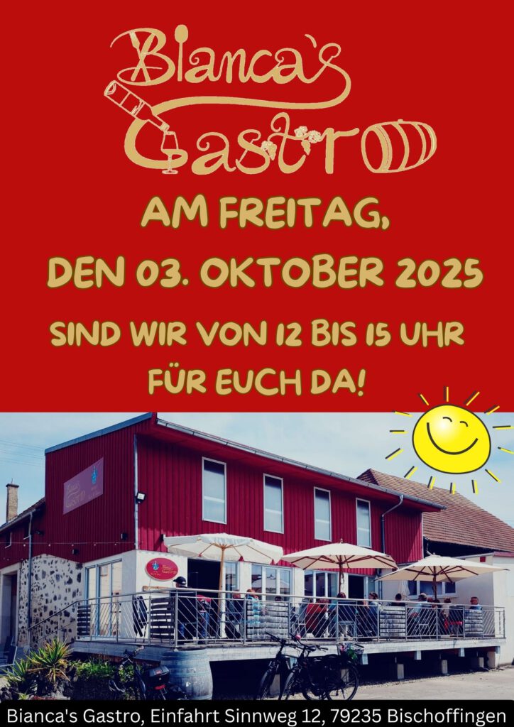 Am Feiertag, den 3. Oktober 2025 ist für Euch BIANCA’S GASTRO von 12 bis 15 Uhr geöffnet.