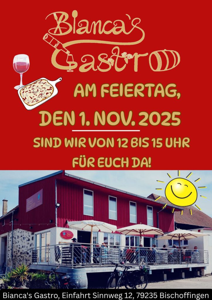 Veranstaltungen Kommt vorbei! Am Feiertag, den 1. November 2025 ist für Euch BIANCA’S GASTRO von 12 bis 15 Uhr geöffnet. VEGANES MENÜ gleich hier anmelden unter: biancasgastro@johner.de Die Plätze sind begrenzt.